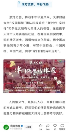 滚灯流转,华彩飞扬。2025年春节喜庆之际,天津财经大学“校园解忧”ד根脉”文化传承志愿服务团队携手天津市河西区天塔街宾水西里社区,通过滚灯表演、非遗手工艺体验、传统民俗讲解等形式,同天塔街“向日葵”共赴一场滚灯文化的璀璨探索之旅,感受中华优秀传统文化的深厚底蕴。近日,教育部新闻办官方微信公众平台“微言教育”对本次活动进行了报道。