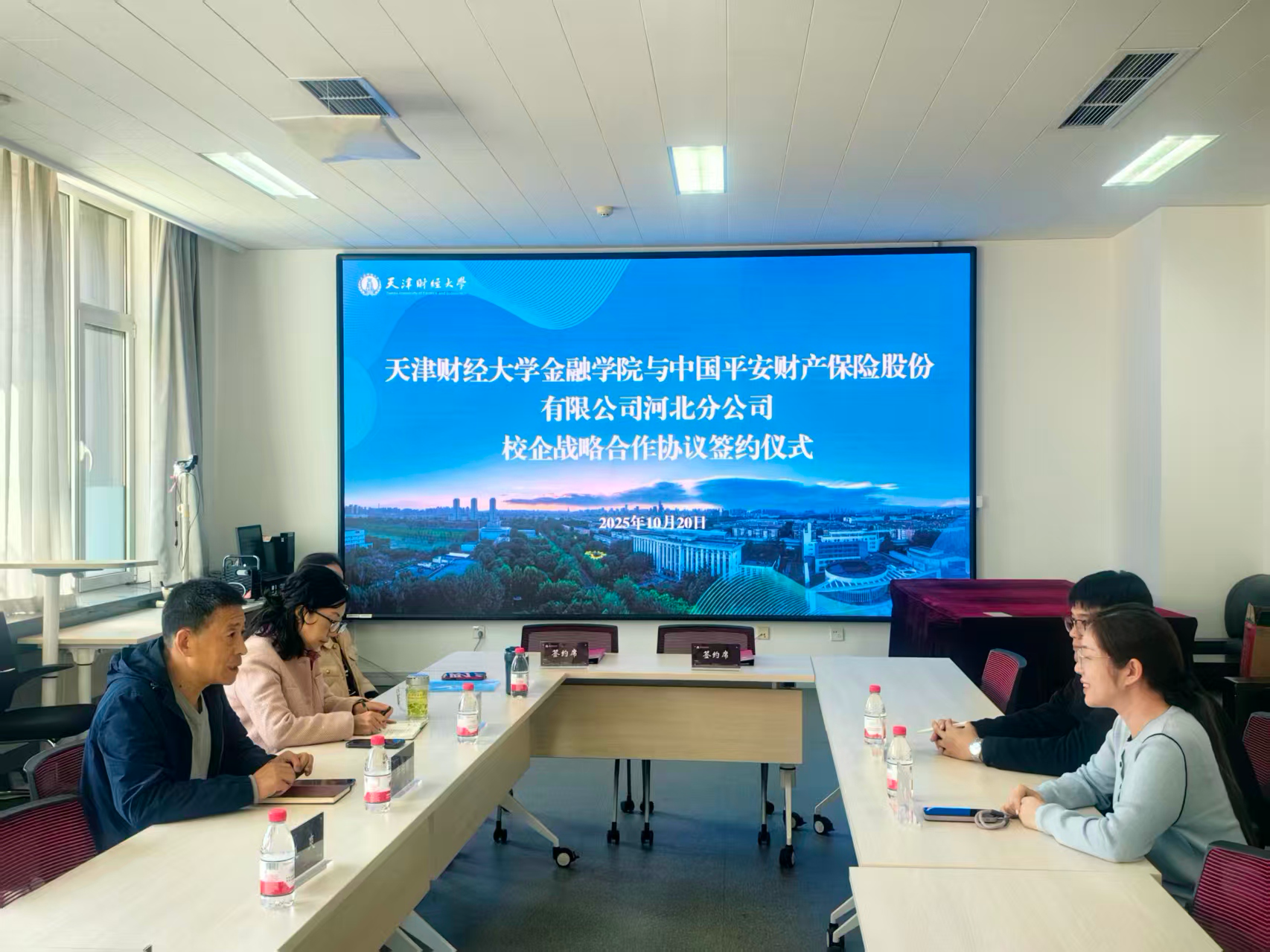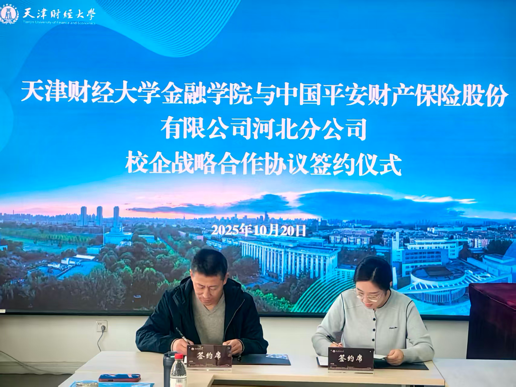 2025年10月20日,我院与中国平安财产保险股份有限公司河北分公司(以下简称“平安产险河北分公司”)校企战略合作签约仪式在我院举行。平安产险河北分公司党委党办主任、人事行政部负责人刘娟、团委主任李航宇,金融学院党委书记院长李向前、党委副书记马静、党委副书记赵爽等双方领导出席仪式并共同见证这一重要时刻。