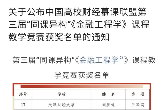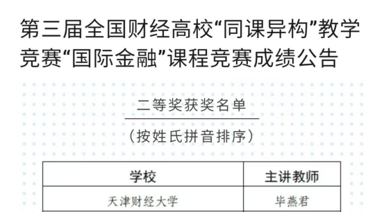 近日,第三届中国高校财经慕课联盟“同课异构”教学竞赛圆满落下帷幕。经过全国三十余所财经类高校参赛团队的激烈角逐,我院教师毕燕君、刘彦迪分别在《国际金融》和《金融工程学》课程教学竞赛中荣获全国二等奖和三等奖,充分展现了我院教师的教学水平与创新能力。