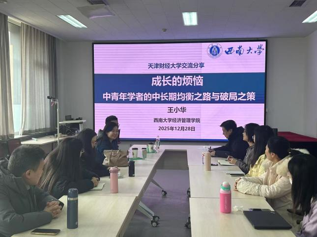2025年12月28日,西南大学经济管理学院王小华教授应邀来到天津财经大学金融学院,围绕“中青年学者的中长期均衡之路与破局之策”开展国家级课题申报专题分享。金融学院副院长温博慧主持本次会议,学院科研骨干教师积极参与。