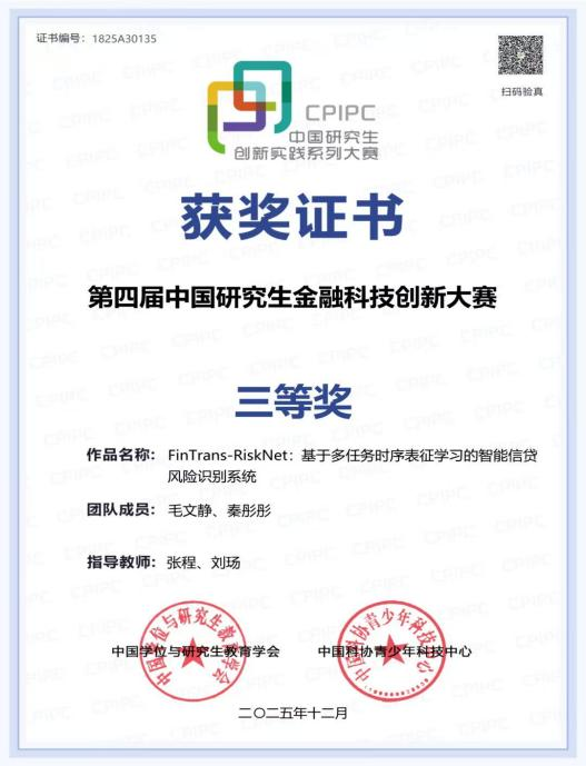 近日,中国研究生创新实践系列大赛顺利收官。我院研究生团队在“华为杯”第二十二届中国研究生数学建模竞赛、第四届中国研究生金融科技创新大赛中分别斩获佳绩。其中,我院研究生郑慧慧团队以《基于迁移学习的高速列车轴承故障诊断模型研究》项目荣获全国三等奖,该团队指导教师为我院教师程瑞华。研究生毛文静团队凭借《基于多任务时序表征学习的智能信贷风险识别系统》项目同样荣获全国三等奖。上述均为金融学院首次在该系列赛事中获奖,实现了新的突破。