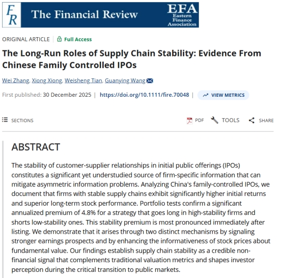 近日,我校金融学院张伟老师以第一作者身份,在国际金融学权威期刊《Finance Research Letters》与《The Financial Review》相继发表两篇高质量学术论文。研究分别聚焦文化迷信对IPO市场的定价影响,以及供应链稳定性在家族企业IPO中的长期价值,为相关领域研究提供了具有重要理论与现实意义的新视角。