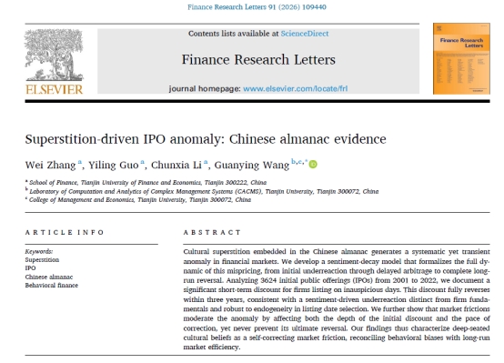 张伟老师与金融学院硕士研究生郭奕伶、李春霞老师,及天津大学管理与经济学部王冠英副教授合作完成的论文《Superstition-driven IPO anomaly: Chinese almanac evidence》,正式发表于《Finance Research Letters》。